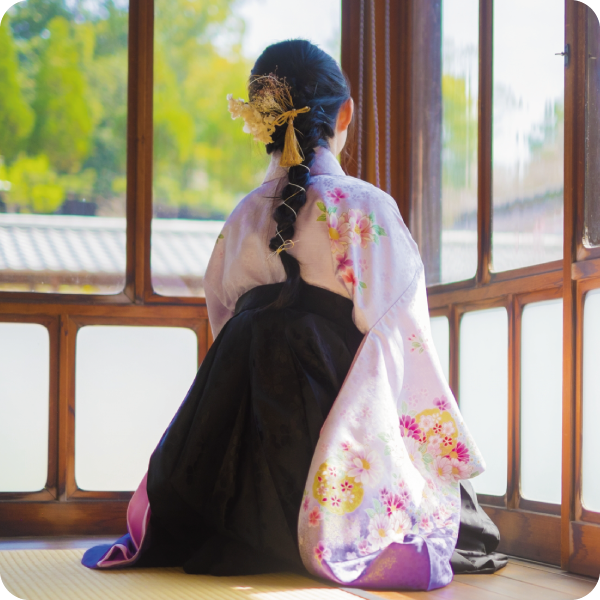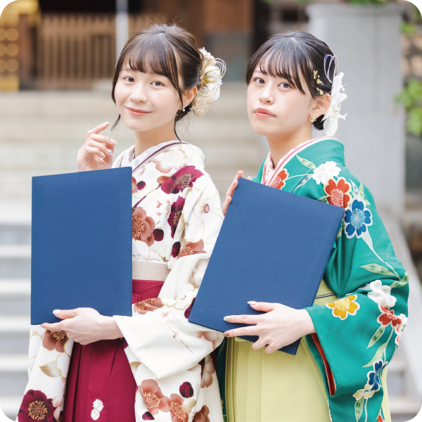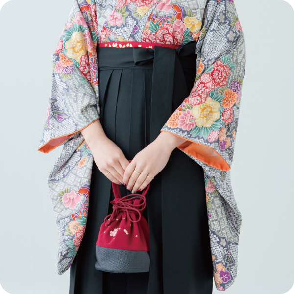 大学・専門学校・高校の卒業式にぴったりの華やかな袴スタイル。二尺袖とのセットで、上品さと華やかさを両立。記念写真にも映える人気の組み合わせです。